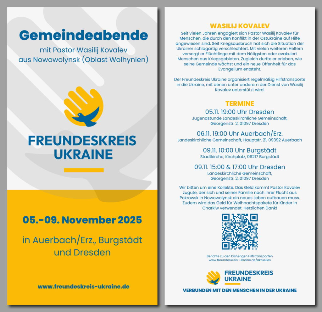 Wir bitten um eine Kollekte. Das Geld kommt Pastor Kovalev zugute, der sich und seiner Familie nach ihrer Flucht aus Pokrowsk in Nowowolynsk ein neues Leben aufbauen muss. Zudem wird das Geld für Weihnachtspakete für Kinder in Charkiw verwendet. Herzlichen Dank!